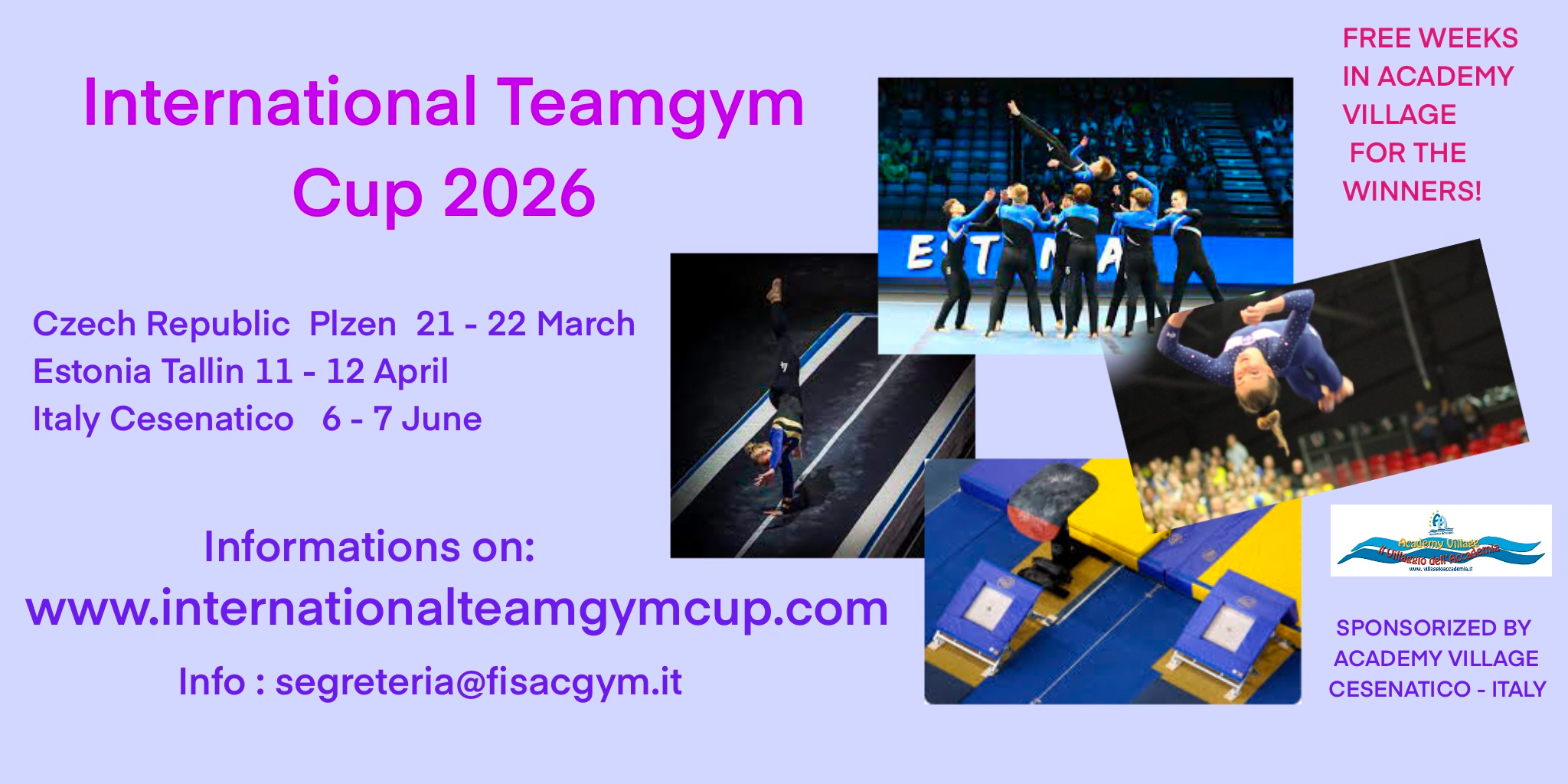 teamgym Datum: 21.3.-22.3.2026 Místo konání: Plzeň Pořadatel: FLIK - FLAK Plzeň, z.s. Adresa: Sportovní hala města Plzně, TJ Lokomotiva Plzeň Přihlášky: do 31.1.2026 https://www.internationalteamgymcup.com/ rozpis: International-Cup-of-Clubs-Technical-Regulations-2026-draft…