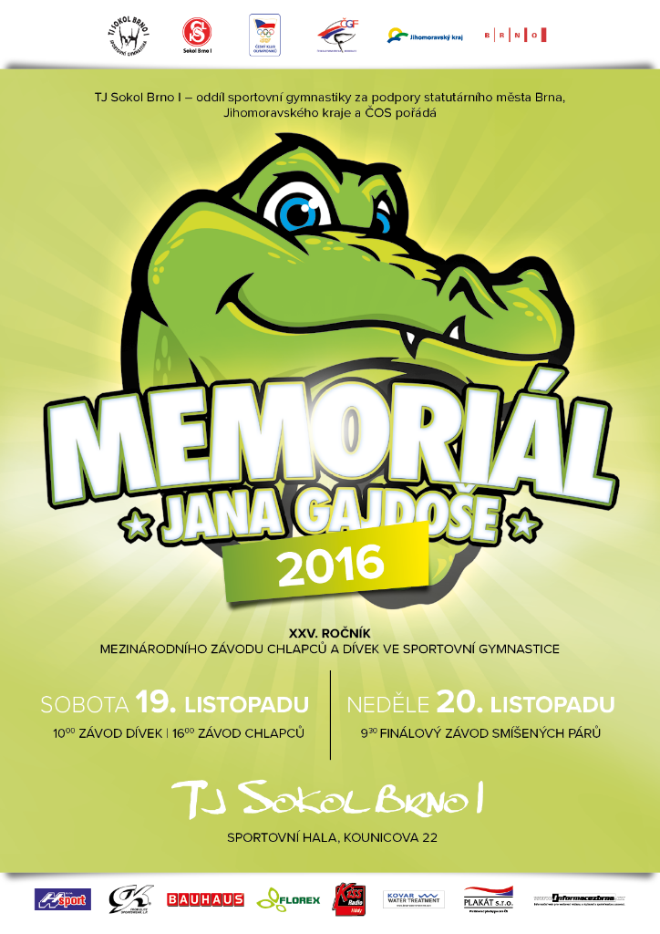 sportovní gymnastika mužů, sportovní gymnastika žen Datum: 19.11.-20.11.2016 Místo konání: Brno Pořadatel: Tělocvičná jednota Sokol Brno I Adresa: Kounicova 20/22, Brno, Čestá republika rozpis: MJG2016-rozpis-prihlaska-cz.pdf výsledky: Gajdos_16.pdf Gajdos_Finale_16.pdf ostatní: casovy-rozpis-zavodu.pdf